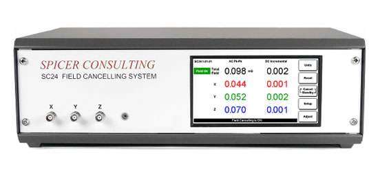 The SC24 system comprises a magnetic fieldcontrol unit, one or two magnetic field sensors and three orthogonal axismulticore cables, that are installed in the room where the field is to becancelled. The SC24 can drive single loop and double loop room size cables. Italso works with Helmholtz cables that are attached to a frame around thecolumn.  Three power amplifiers in thecontrol unit drive  currents through thecables to create a field of the opposite sign to the change in ambientfield.  The magnetic field sensormeasures the resulting field and real time negative feedback reduces theambient field by the loop gain of the system. The system is dynamic,automatically responding to field changes within 100 µs.