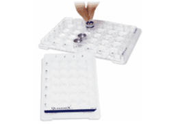 The Multi-well Plate is designed to enableparallel handling of multiple QX-102 Capsules. It serves as a well plate forholding the capsules during various manipulations, for culturing cells inQX-102 Capsules, and for inspection in an inverted light microscope. TheMulti-well Plate is specially designed to maintain humidity of the samplesduring incubation, and is compatible with standard laboratory equipment.