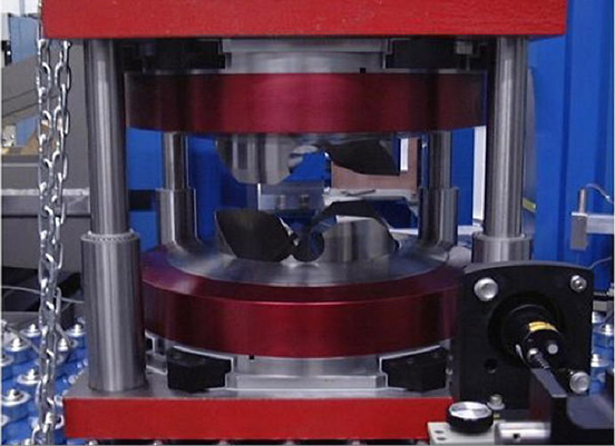 The intention of this research was to allowcalibration of thermocouples at very high pressures, which has never been donebefore. The same device also has beam ports 35 degrees off of the vertical axisintended for X-ray diffraction work with the press and module placed in thebeamline horizontally. The device is currently being used at the DaresburyLaboratory in England.1000 Metric Ton Custom Built Press
