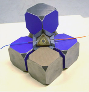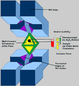 Rockland多顶砧装置可提供的压力高达250 kbar,温度高达3000 ℃。如图A所示,样品被放入一个八面体内,外部压力传递物质则由氧化铝、叶腊石或其它陶瓷材料组成。八面体的八个面分别由八个碳化钨(WC)立方压砧切角而成(图A的橙色区域)。立方体依次被嵌入由工具钢制作而成的半球形底座或圆柱形底座内,然后被切割成分段以匹配更大的支撑模块。到目前为止,这些装置非常笨重,需要花费极大的压力和操作使得它达到相应压力。