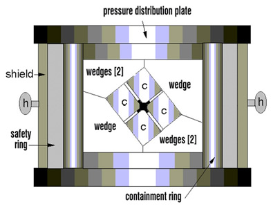 哥伦比亚大学的David Walker教授解决了如何使得大块物体的压力维持在50-250 kbar的主要技术障碍,他提出了将多顶砧简化的设计和技术。正如横截面示意图下端所示,一个圆柱形的楔子被用来固定WC压砧。楔子并没有固定,可以在支撑环内浮动。大型支撑块没有被使用,加压过程中的弹性应变通过支撑环加以消除。