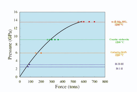 图表反映了压力标定比为14/8(油缸压力VS相变材料压力)。Walker型多顶砧可提供的压力最高达25 GPa。六个压砧楔子对八个立方体施压,然后通过压力传递物质将压力传递给一个正八面体。利用铸瓷和半烧结陶瓷作为传压介质,对各种样品组装并进行压力标定。此装置现在用于加州理工学院Paul Asimow教授的实验室。