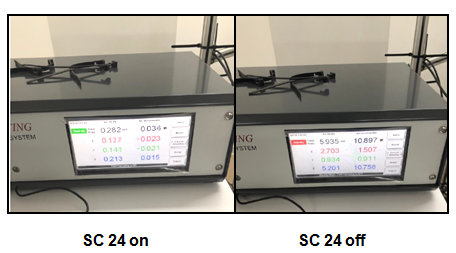 当关闭SC24消磁器时,交流磁场AC为5.935 mG(X、Y、Z方向分别为2.703 mG、0.934 mG和5.201 mG)、直流磁场DC为10.897 mG(X、Y、Z方向分别为1.507 mG、0.911 mG和10.758 mG)。