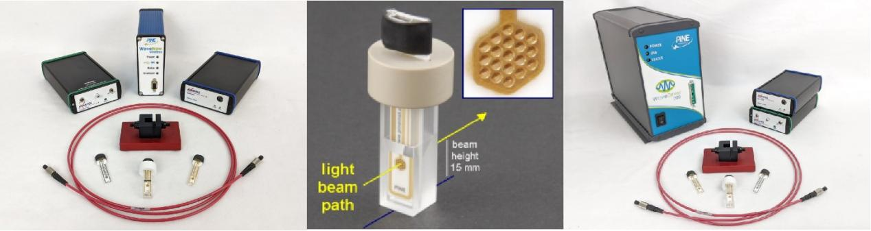 美国Pine 光谱电化学测量系统由电化学工作站以及紫外/可见光谱仪组成,配合设计独特的蜂窝状电极,以及 AfterMath软件,同步控制电化学工作站和光谱仪,实现光信号和电信号的同步、原位、实时控制和采集。该系统快速、高效、易于使用且稳健。工作站可以选择Pine的WaveDrive系列(WD100、WD200),也可以选择Pine紧凑型系列(WaveNow),实现小型化,户外等特殊场合使用。
