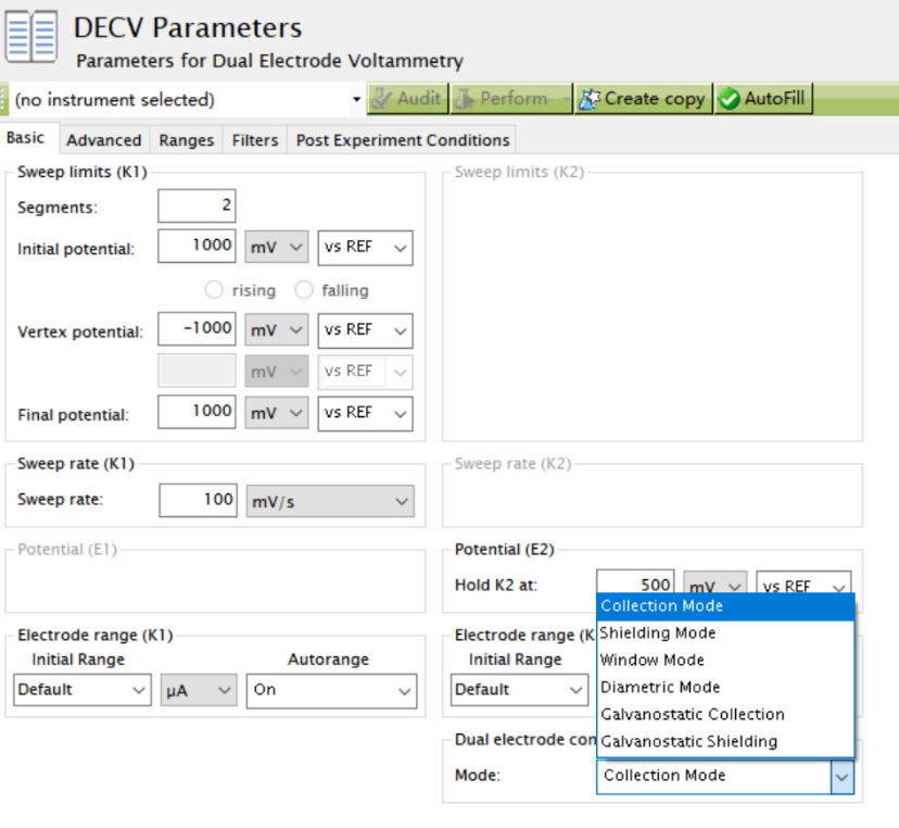 Collection Mode:盘电极设置CV或LSV方法,环电极设置恒电压CA方法;